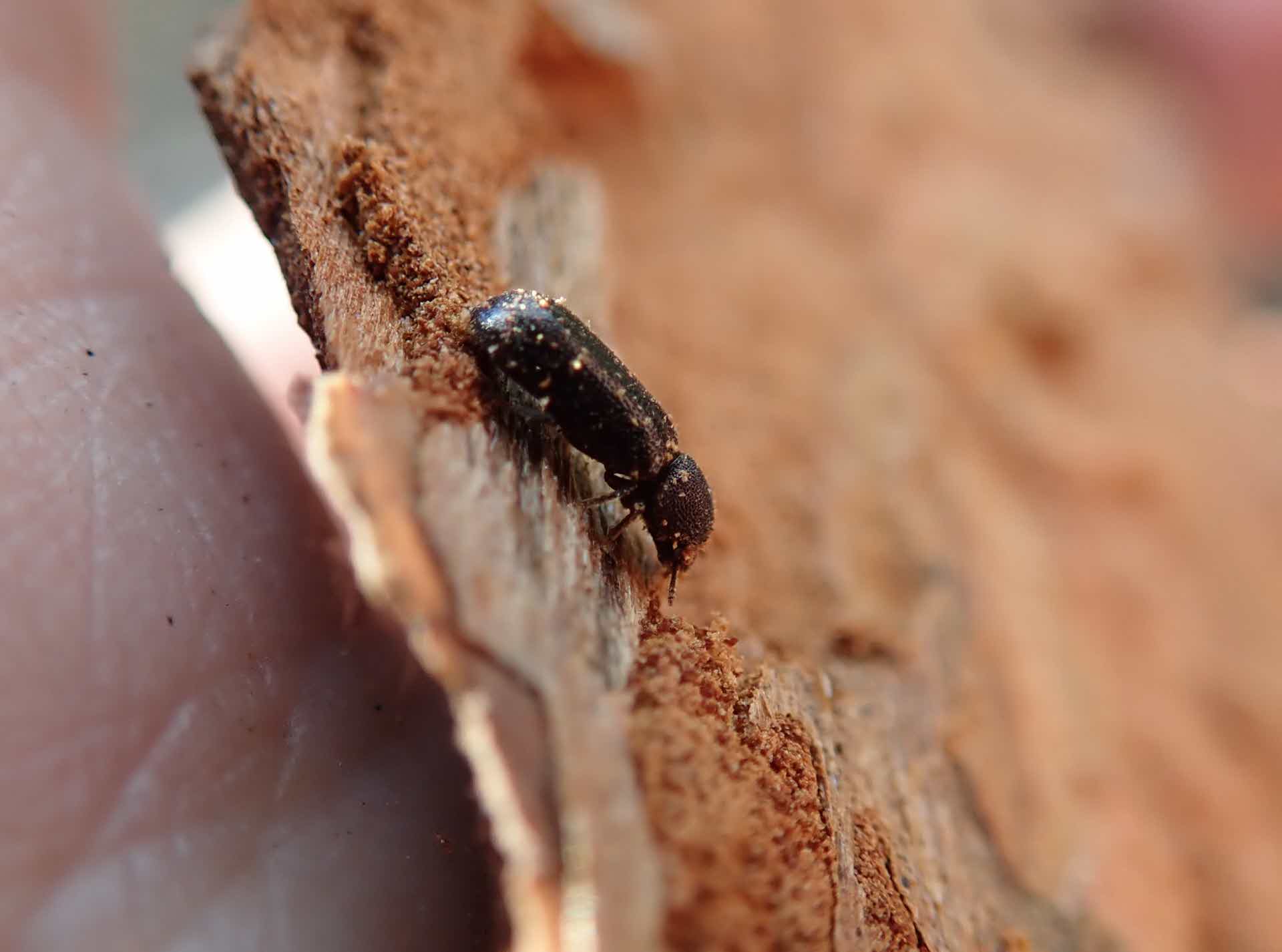 Många andra insekter lockas också av bränder, men kommer först ett tag efteråt. Här vid Återvänningen, nordväst om Stora Laxsjön, har SCA bland annat hittat spår av den sällsynta tallkapuschongbaggen som lever i brandskadade träd.